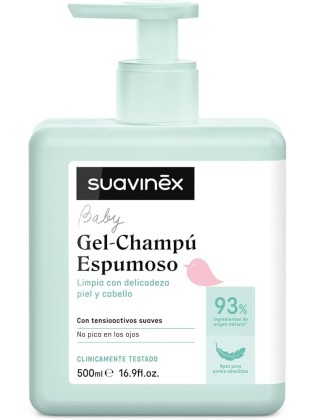 El gel-champú de Suavinex limpia de manera suave la piel y el cabello del bebé gracias a su fórmula syndet (sin jabón).